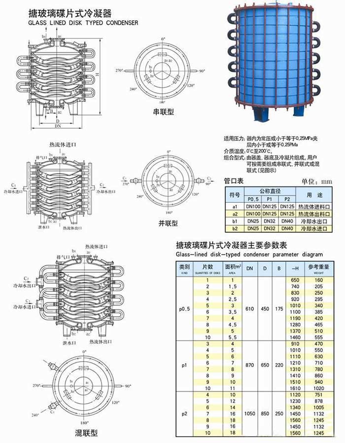 搪玻璃蝶片式冷凝器是將含硅量高的瓷釉涂于金屬表面,通過(guò)950℃搪燒,使瓷釉密著于金屬鐵胎表面制成。因此,它具有類(lèi)似玻璃的化學(xué)穩(wěn)定性和金屬?gòu)?qiáng)度的雙重優(yōu)點(diǎn)。